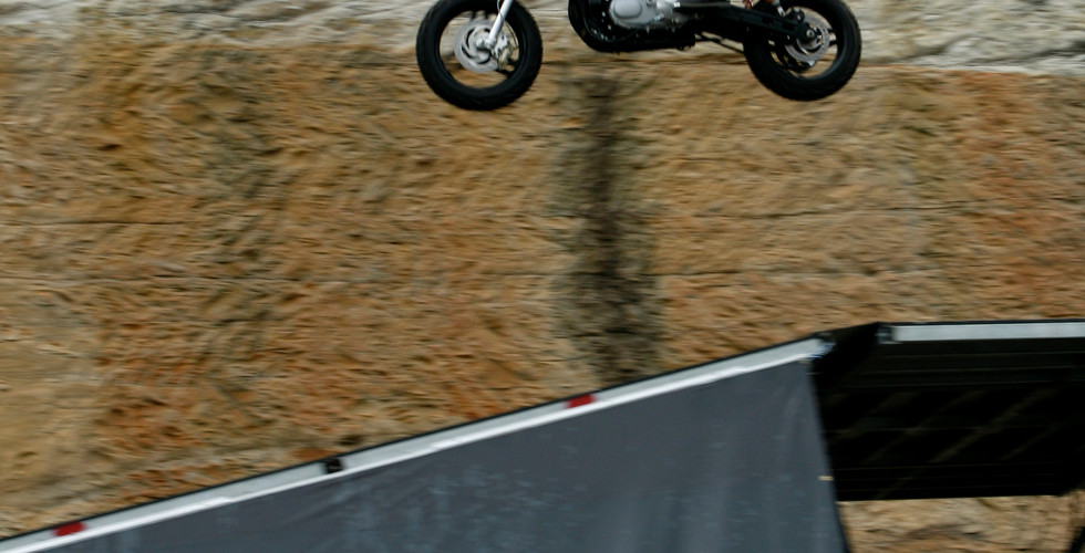 Seth’s first attempt at the overall record was made at MotoX rider Mike Cinqmars’ property on a customised Honda CR250 with a 500cc two stroke motor fitted. The first day the jump ramp made its way from 120 feet to a distance of 240 apart with the crew calling it a day due to the side winds. The next day the wind had turned and made for tailwind and making for a safer jump the jumping continued and the first jump was predicted to be around the 220-230 foot but the tailwind at the jump was far stronger than anticipated and pushed 245 feet and far passed his landing ramp and landing flat on the ground. The flat landing caused Seth to hit his head on the handlebars and crushing his skull above his right eye, he was then rushed to hospital where doctors made an incision from ear to ear, peeled his skin off his forehead down and inserted two titanium plates. Seth was then told by doctors he was to have a six month break from riding but the ever stubborn Seth was to ignore Doctors recommendations and four short weeks later broke the overall indoor record of 170 feet at the Los Angeles Coliseum.