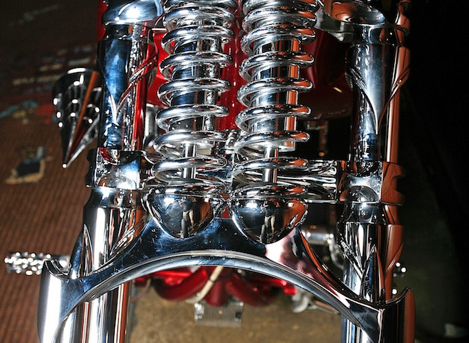 Pieter recruited the services of Brett from Hell Bound Choppers to help in the refurbishment. First changes were to be the front end. Pieter and Brett discussed using a Springer front but Pieter had issues with using a traditional Springer because he didn’t think it would be strong enough with the 39 degree rake. They decided to go with the American Suspension front end having to import one from the USA. At the time the Aussie dollar was at a crap 68 cents US so the front end blew out to a whopping $7,500 just to get it to our shores. Looking back at it Cas isn’t dirty but happy with the front end and says “it’s money well spent and there isn’t any around, so I’m happy!”