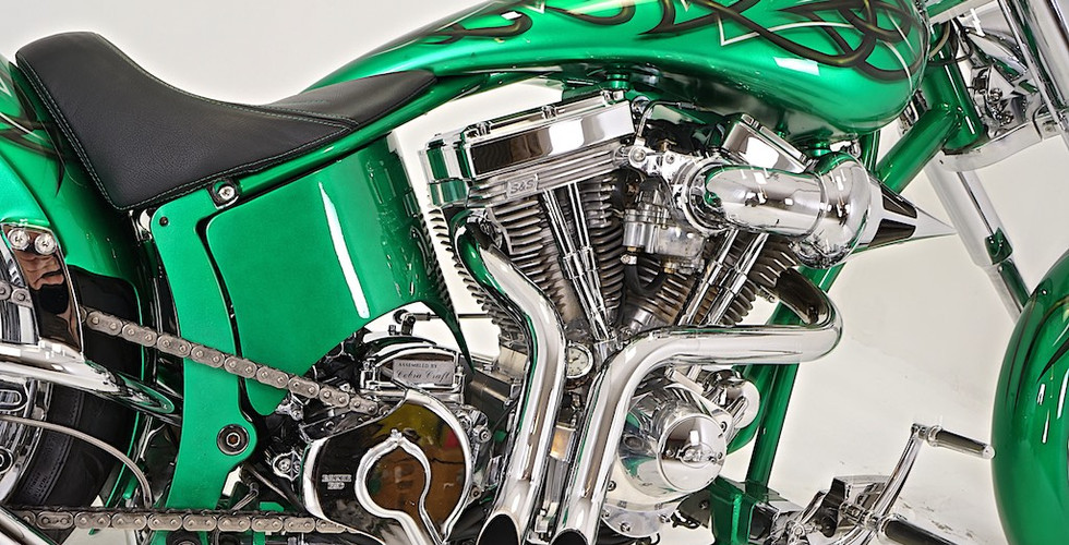 The bikes front end was the first step and the standard forks were replaced with American inverted suspension, the PM (Performance Machine) 4-piston caliper and rotors were serviced and remounted front, as were the PM hand and foot controls. The 2” Dakota speedo also stock was remounted Cobra Craft fabricated a custom slider brake line and the line for the custom hydraulic clutch.