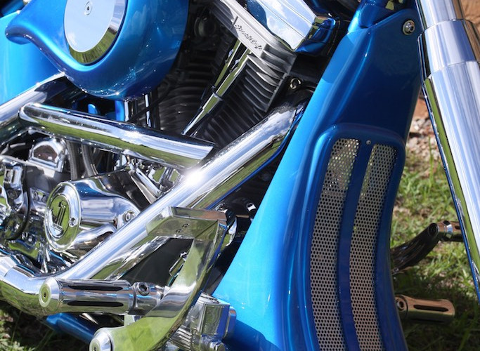 The standard exhaust gave way for a $1000 Vance and Hine’s system, only it didn’t work so the boys went back to a Harley System and replaced the aftermarket pipes with a set of Screamin Eagle pipes with crossovers. Forward controls, shift rod and rear pillion pegs are OMP.