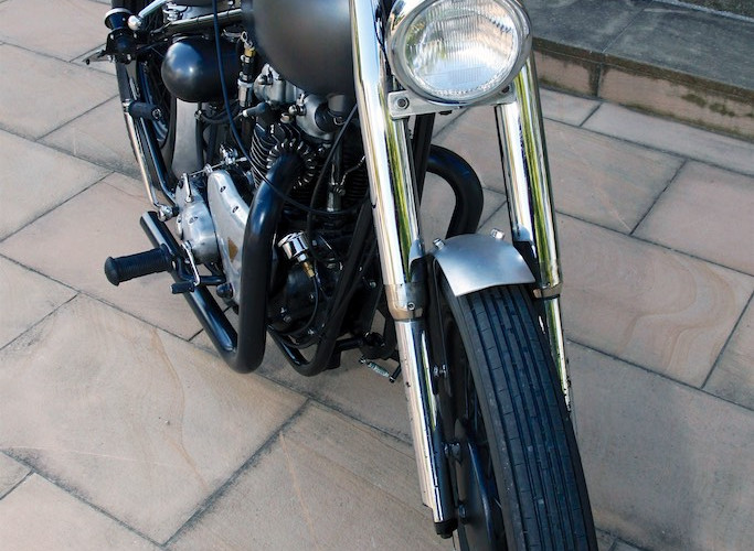 The custom frames come bare and all brackets including those for the guards and the steering stops were hand fabricated with many of the brackets positioned to be hidden from sight. The front end was a complete Triumph Standard Pre-Unit assembly but as with most bikes of its age in need of a complete rebuild. Trojan stripped the forks down and reconditioned them. The original fork sliders had lost their chrome and they had the old weathered patina that Nick was aiming for so the sliders were re-fitted. The shrouds were beyond repair and needed replacing. By chance Nick was in the shop (Trojan) one Saturday when a customer happened to mentioned how he had a set of brand new original covers still wrapped in the original paper. So Nick bought them for the right price and they were fitted.