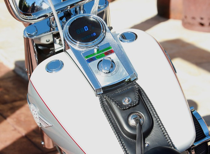 Adam’s take on the bike was spot on with what Ben envisioned and he also knew he would have his work cut out and he was the right person for the job. Adam’s take on Ben’s vision was something of a restoration and to keep the bike from looking tacky and keep the bike a Harley Davidson. Adam says he could have much easier thrown in an S&S motor and aftermarket gearbox, but not with Ben, ben wanted an enhanced Harley Davidson so the motor and gearbox had to be fully stripped down and enhanced. The heads were Power flowed with four angle cuts. A process used by Formula 1 and NASCAR teams where the valve seats are angled cut and an abrasive media blasted through the heads. The angles change progressively so when the valve opens the flow starts early, which means greater air flow (CFM) and powers comes up and a 600 lift cam was fitted to tie in with the heads (APL possess the only power-flow machine in Australia and import their heads worldwide). The comp pipes were closed and the crank balanced. The full strip down meant weeks of works with the cosmetics also, the motor needed to be repainted and all the nuts and bolts polished and chromed. Adam did decide to run with a Bandit primary for its clutch action, smoothness and quietness and decided to keep the standard carbie with PM (Performance Machine) filter which was a punt that payed off with the nice clean note made by the EVO make it easily confused for a fuel injected bike and the way the primary whistles through is also a nice smooth sound and not rattly as with many other aftermarket primaries. The once docile EVO now puts out around 120HP; the gearbox was fully rebuilt with Andrew Gears.