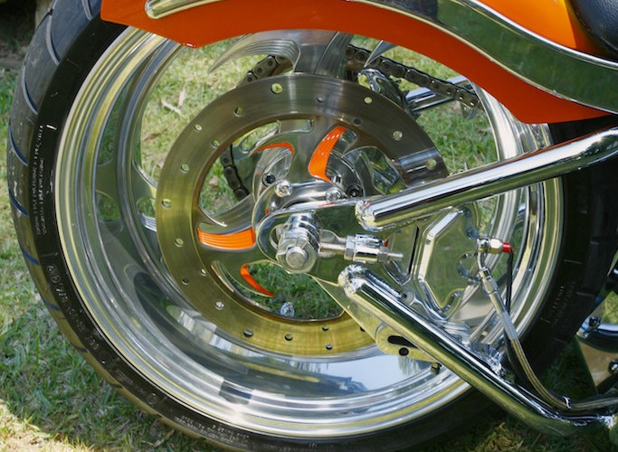 The Streeter’s feet (wheels) are Ultima Bayonets and stopping power courtesy of six piston callipers both front and rear. The Streeter is “Pimp” as the young folk say, from the orange flame on the tanks, the chrome frame and bling from Pro-one and Arlen Ness accessories. By first impression and the quality finish of the Pro-Streeter you’d be excused for thinking the boys are pro builders. Frank and brother Jimmy are proud of the fact they fabricated the bike down to the wiring harnesses, as the boys full time jobs are as pool table manufacturers and importers of Harley Davidson and Rock-Ola juke boxes for the past 17 years.