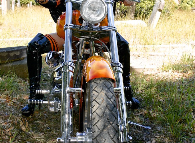 The Streeter was built in stages, starting with a Softail frame, which Frank and his brother and best mate Jimmy stretched, modified the rake to 7 degrees and chrome, a 240 rear end and air bag suspension. The Streeter is powered by a ballsy 113 cube Ultima, six speed cruncher box, S&S E series carbie, driven by a 3.5 inch BDL top fuel belt drive, a West Coast oil tank and LA Chopper’s ground thumper pipes for the note. Frank swears by the air ride saying, quote “Pumped up to ride, lowered or dropped for the Low Rider”.