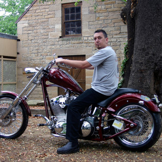 The Scarecrow was a collaboration between a father and son, Garry and Shane Clifford. Garry is an Old School Biker and veteran builder who went about convincing his son Shane to palm off his pride and joy, a Nissan Skyline to invest in a custom bike. Shane wanted a complete bike, once again Garry convinced the young bloke to have faith in the old man and his abilities. The boys decided on a complete kit from Natli’s. Shane wanted to build an everyday ride that was show quality and comfortable. A custom bike isn’t a custom bike without a couple of alterations. Back at the shed the fellas went about cutting here and there and raising the mount of the tank. Garry is Old School and unlike many of todays builders resists the temptation of spraying the frame and tins before mock up. Mock up is the building of the bike and gives the builder the opportunity to see the look of the bike and also makes for a good time to come up with any themes, make any changes or alterations to the running gear. The kit came with a 113 Ultima motor and 250 rear end, besides subtle frame changes Garry and Shane replaced the pipes for a set of Santee’s, forward controls and stand from the original kit. The boys went with spoked rims rather than billet, but did use billet headlight and blinkers. Garry puts this down to the Billet rims being too common. The Scarecrow’s other standout accessories would be the 3”BDL belt drive, custom cover and digital speedo. Mock up took a week, it then took two days to pull down and off to paint. The boys went with a cherry black and custom grey metallic marble on the frame and tins, courtesy of High Quality Smash Repairs. They decided to break the paint up with a mural with the inspiration and eventually the theme coming from Shane’s tattoo on his leg of a Scarecrow with a sickle. The paint took eight weeks and it was another week to build for rego. Even with engineers certificates it is extremely difficult getting a custom motorcycle passed in N.S.W. The boys were made to go back and supply measurements. The Roads and Traffic Authority wanted measurements from the handle bars to the top seat, neck to centre of front wheel. Garry and Shane came through with flying colours, in fact the neck to centre of wheel measurement was ten millimetres under regulation. Shane got his custom daily rider and would like to thank Garry, the old man for the build, the wife for understanding, Mick from Spider Industries and Natlis and special thanks going to Daka, Shane doesn’t exactly know why?