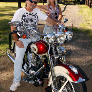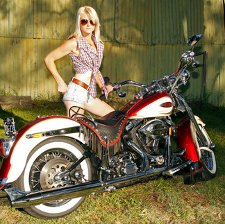 Bike owner Doug Glavan tried to keep the original integrity of his 1997 Softail Heritage Springer when designing it and what he has come up with is a tasteful and individual example of a Heritage without losing any of its heritage or charm. Doug has only been riding Harley’s for the past five years and whilst he always liked them only got the bug as he puts it after his wife got him a ride with Wild Ride. Doug recounts having being picked and taken around the bloke and thinking I have to have one and immediately started searching the Web and found the Springer in Melbourne, the bike was owned by a Black Uhlan’s member who was going through a bad trot and was pretty crook (sick) and had to unload the bike. Agreeing on a good price Doug shot down to Melbourne and picked it up. The bike was the original full dresser and Doug as with most Harley owners started adding his own touches and started by pulling the bags and accessories off and adding his own accessories (mostly chrome) and again like most decided to go all out. The first thing he did was to get good friend Vince Surace to give him a hand to strip the bike down and get the tins to Joe Webb to be sprayed whilst the bike was being rebuilt and modified - Bad Arse Seats were given the seat. The bike was off the road for six weeks, there was more chrome fitted and the gear shift linkage road and struts sent to Melbourne to be chromed. The seat was trimmed with flame stitching , a Kuryakyn number plate holder fitted, head bolt covers painted and flame running boards, pegs and grips fitted to match the seat. Chrome hand controls, blinker bezels and oil filter fitted, even the bleeding nipples on the chrome reservoirs had to be chrome. Doug went with 1 1⁄4’’ Burley Bars which Vince internally wired, Kuryakyn blinkers and skull air filter fitted and fish tail pipes.